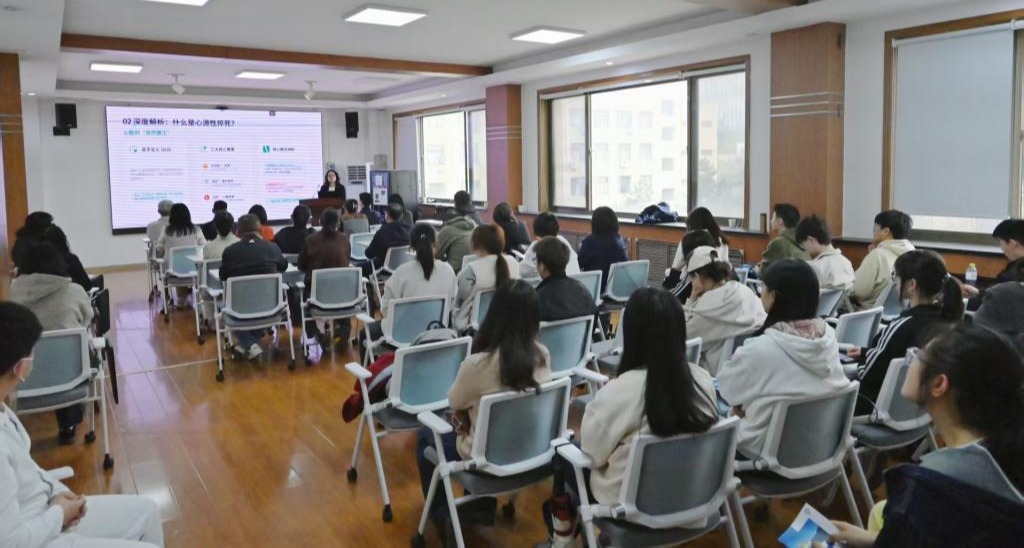 在政管学院,心内一科主任郭琳琳作《高血压患者的治疗性生活方式干预》专题分享。她以“每4个成人就有1人患高血压”“高血压人群平均寿命缩短15-20年”等数据敲响警钟,深入解读“限盐、控重、戒烟、限酒、运动、减压”六大干预措施。同时,她介绍医院特色心肺运动试验,可为个体定制科学运动方案,助力师生实现精准健康管理。两场讲座内容详实、语言生动,现场互动频繁,反响热烈。