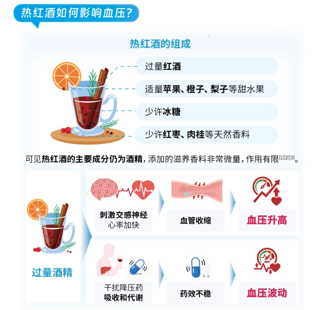 还有些人觉得热红酒里加了肉桂、红枣就是养生,其实这些食材的微量营养,早已被大量酒精和糖稀释,根本抵消不了升压伤害。而“红酒含白藜芦醇护心”的说法,更是一个误区!