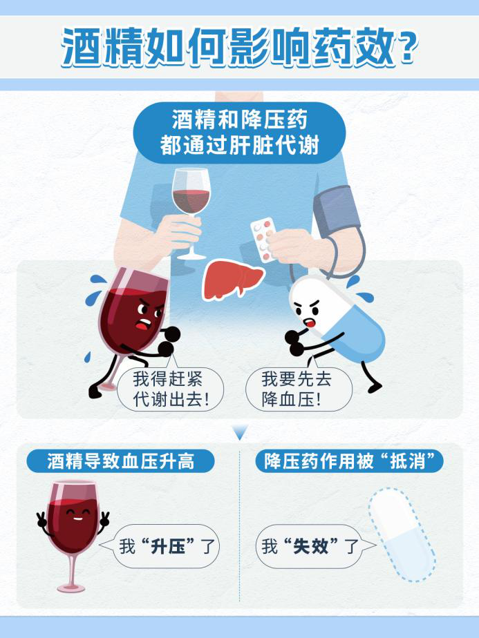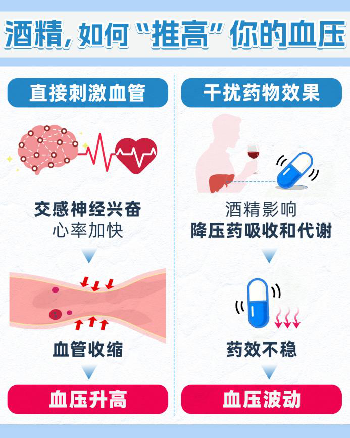 酒精会直接刺激血管,引起血压升高;还会干扰降压药物的吸收和代谢,让药效打折,导致血压波动。
